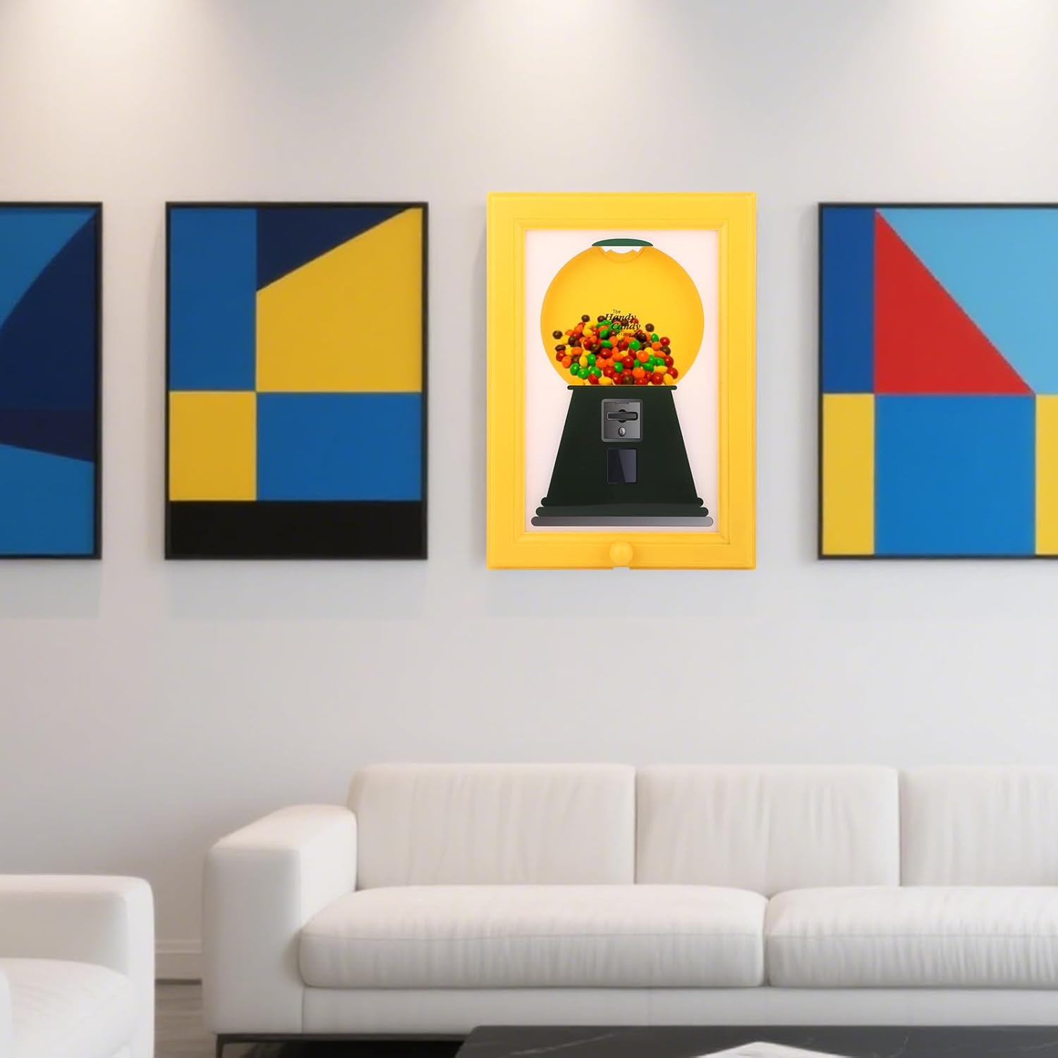 Vorstellung des Süßigkeiten-Rahmens – die Wanddekoration, die LECKEREIEN AUSGIBT! Perfekt für Snacks, Nüsse oder Leckerlis für Haustiere. Einfach den Knopf drehen und zusehen, wie die Süßigkeiten fallen!