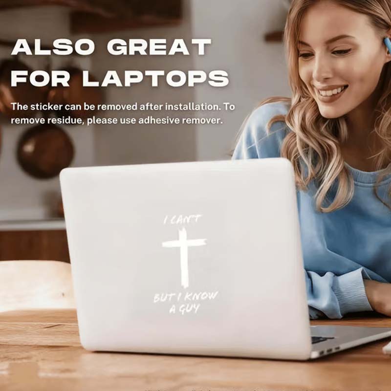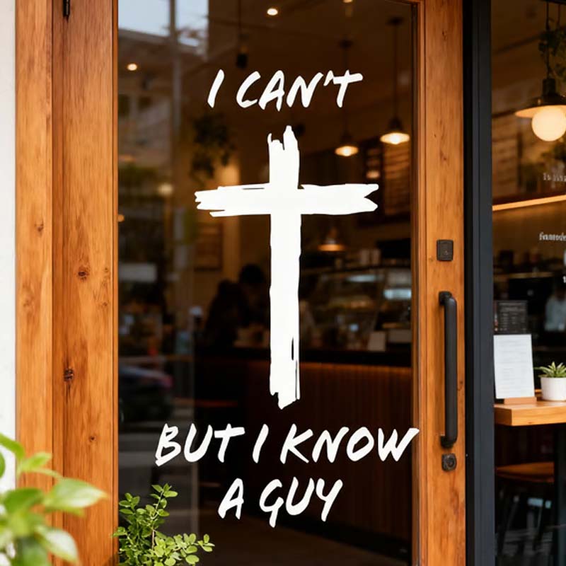 Präsentiert den kraftvollen Spruch "I CAN'T BUT I KNOW A GUY" zentriert um ein Kreuz. Ein aufbauendes Glaubensbekenntnis, das Mut macht.