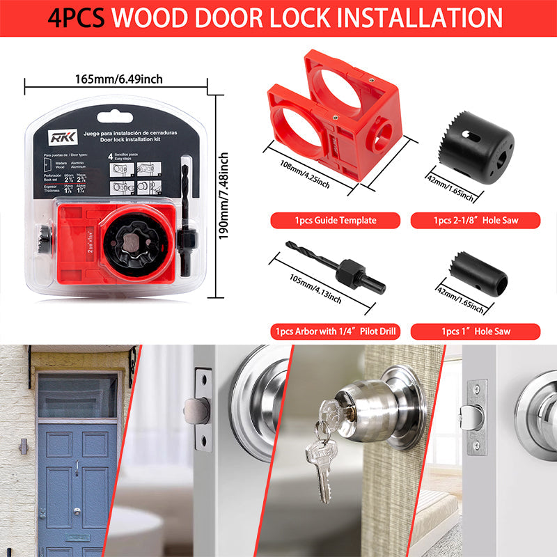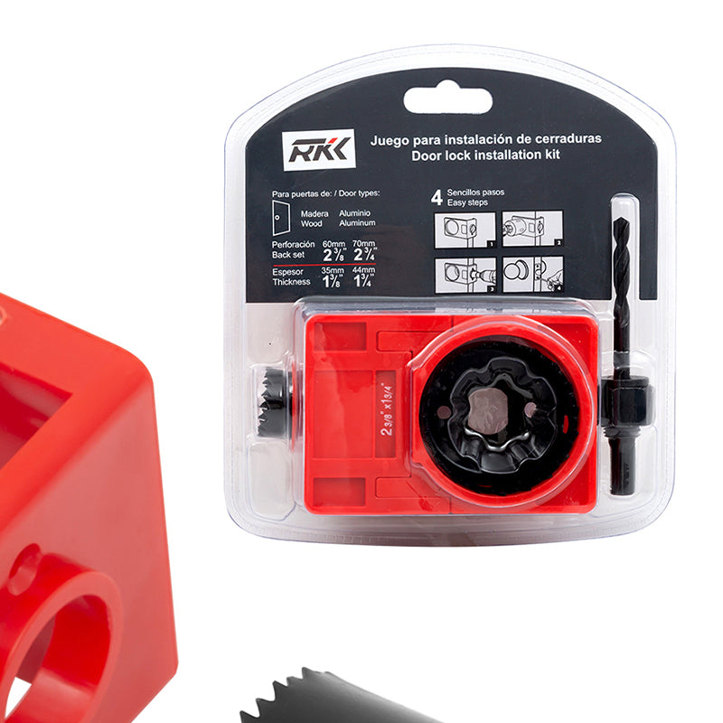 PAKET ENTHALTEN – Das Türschloss-Installationsset enthält: 1 x verstellbare Führungsschablone aus Kunststoff, 1 x 2-1/8" (54 mm) Lochsäge, 1 x 1" (25 mm) Lochsäge, 1 x Dorn mit Bohrer.