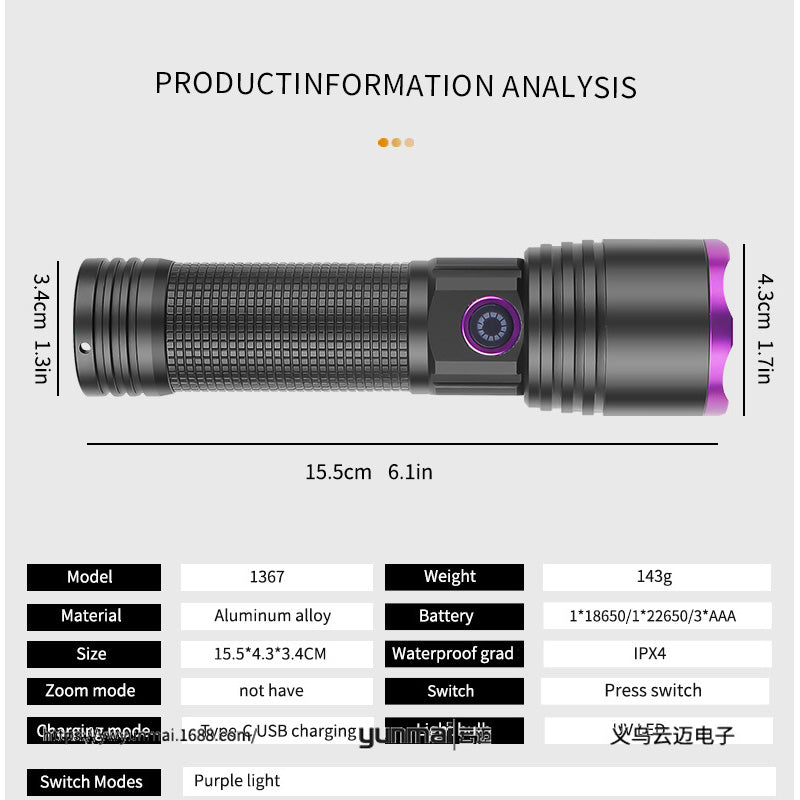 Lieferumfang: 1 * Typ-C-Ladekabel, 1 * Batterie, 1 * wiederaufladbare multifunktionale UV-Taschenlampe