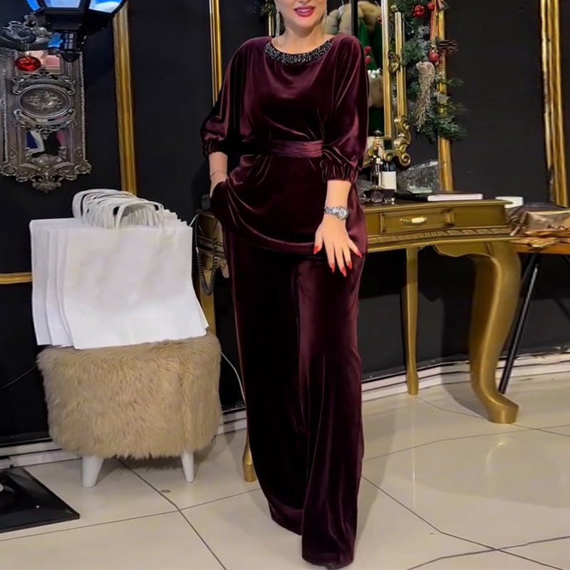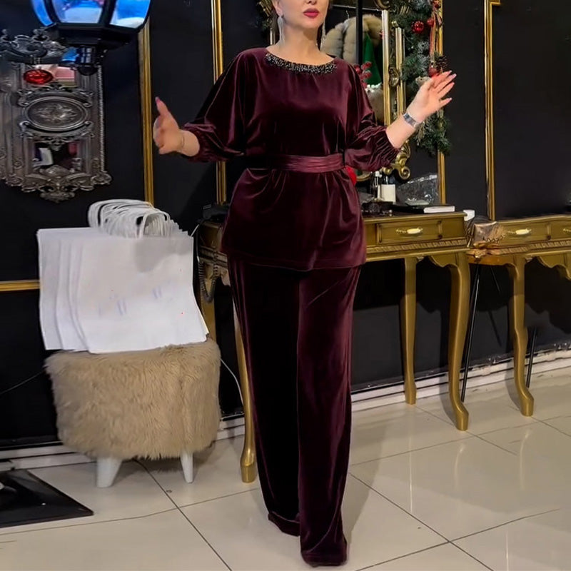 Rundhals-Top mit Strasssteinen & Hose mit weitem Bein – 2-teiliger Set