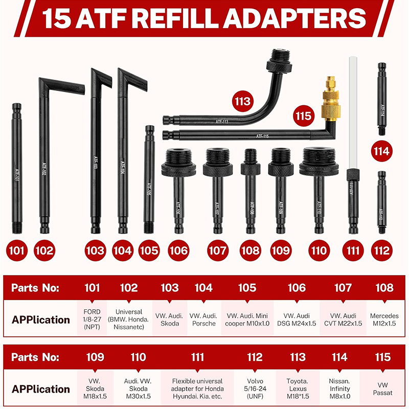 VERSATILE CONNECTOR OPTIONS: Comes with a variety of gearbox aluminum alloy connectors, including models like ATF - 107, ATF - 108, and more. These connectors are compatible with a wide range of vehicle brands and models. The versatility eliminates the need for multiple tools, streamlining your workflow.